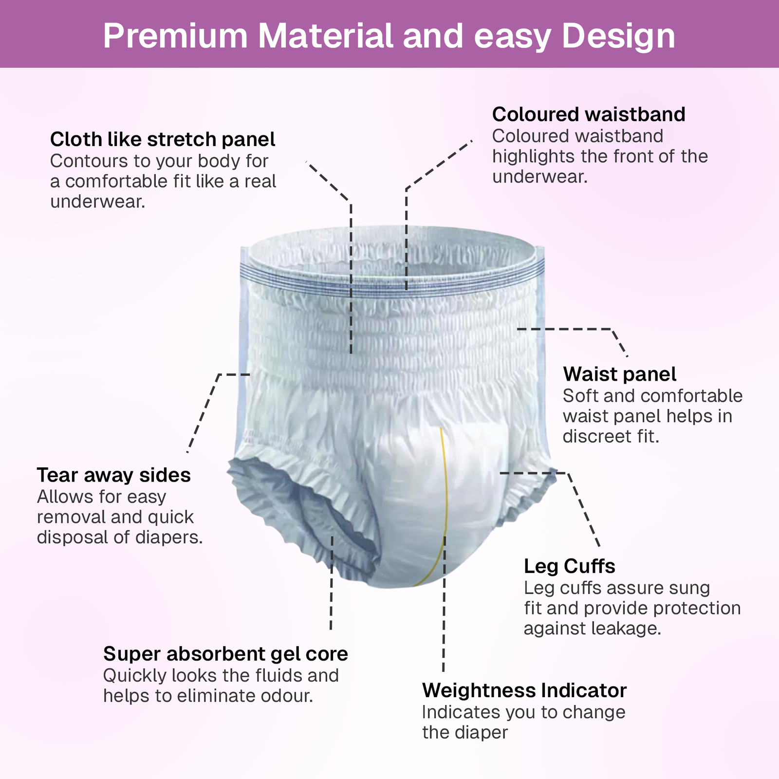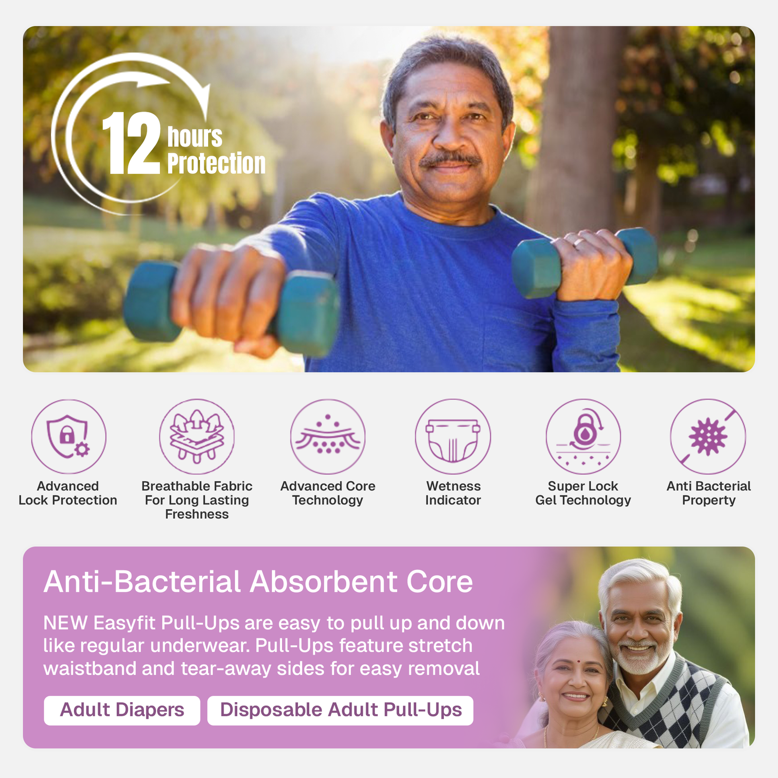 The advanced wetness indicator makes monitoring easy, while the high-absorbency core quickly locks away liquid to keep the skin dry and irritation-free. Their antibacterial and odourless technology ensures freshness and hygiene, providing maximum confidence for users and caregivers. With a pull-up design similar to regular underwear, EasyFit Adult Pants offer ease, dignity, and convenience.