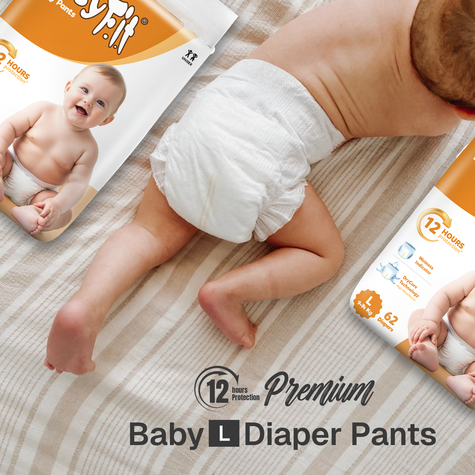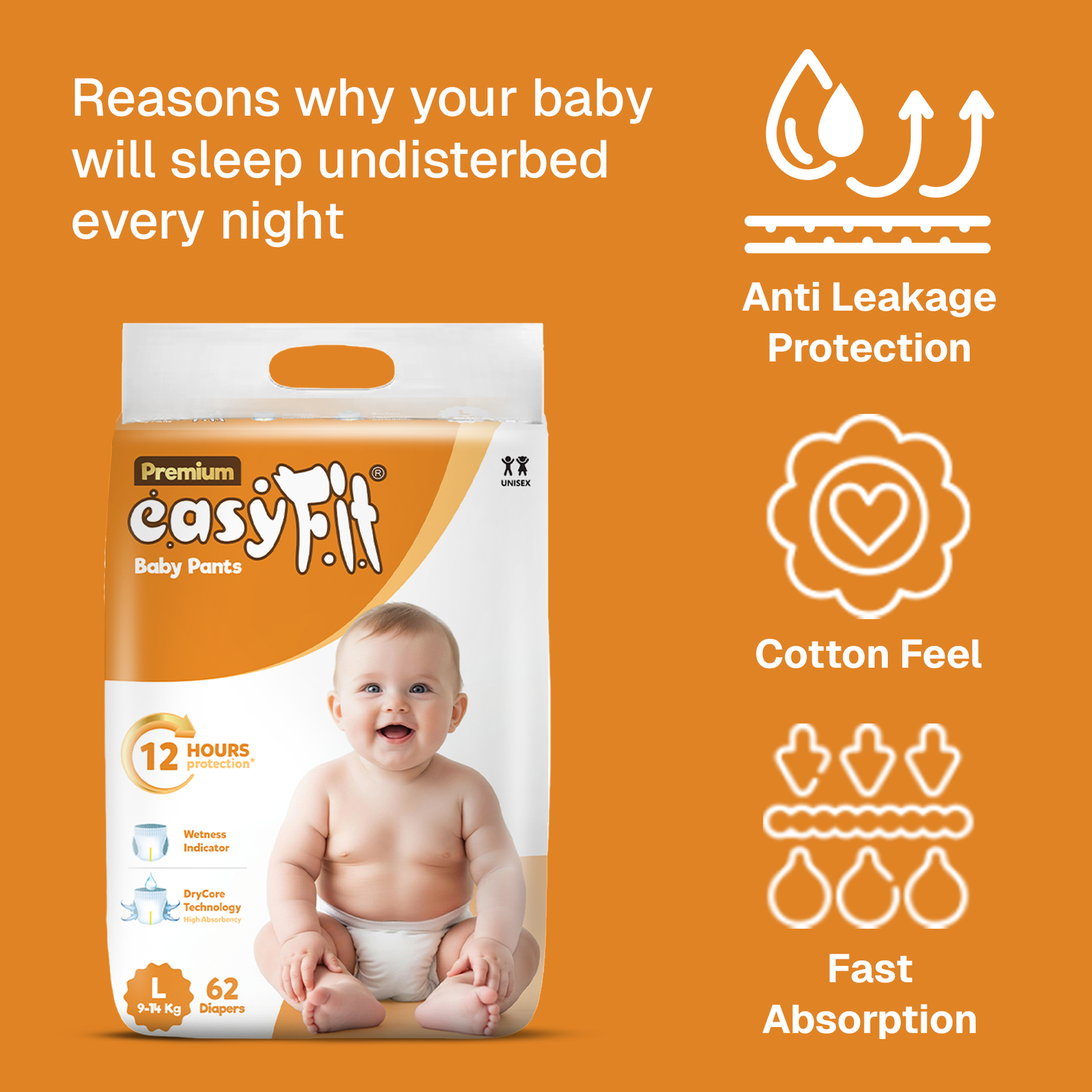 Provide your baby with superior comfort and reliable dryness using EasyFit Premium Baby Pants – L, crafted for active babies who need long-lasting protection and freedom of movement.
